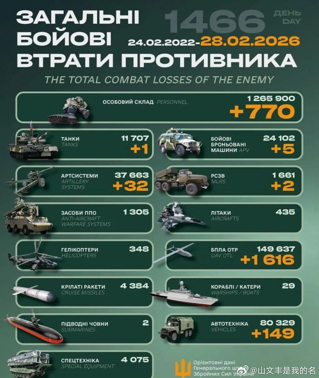 乌俄战争进入第1466天,乌克兰总参谋部发布战报:过去24小时乌俄双方交战140次,其中36次在胡利亚伊波列(33次在苏梅)、23次在托列茨克、12次在莱曼、30次在波克罗夫斯克、6次在南顿涅茨克区域。毙伤俄770名。俄军累计损失1265900人。摧毁俄1辆坦克、5辆装甲车、32门火炮、2个火箭发射装置、1616架大型无人机、149辆军车。