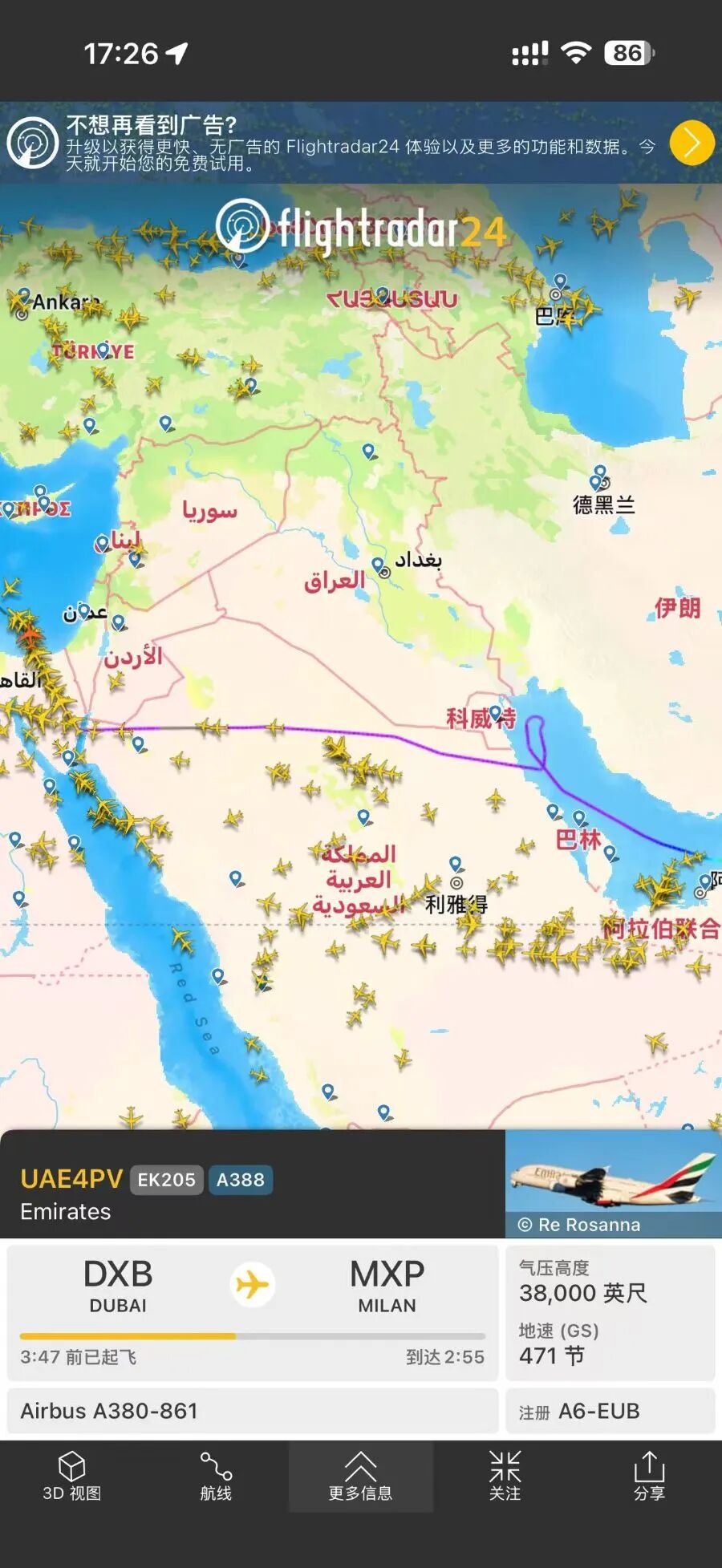 至于中东三大航空枢纽城市,迪拜、多哈和阿布扎比,原本有大量连接亚非欧的航线,记者注意到,以迪拜机场为基地航司阿联酋航空目前的航班仍在正常飞,但通过绕飞避让伊朗空域。比如阿航EK205飞米兰的航班,目前便转道沙特和埃及再去欧洲。