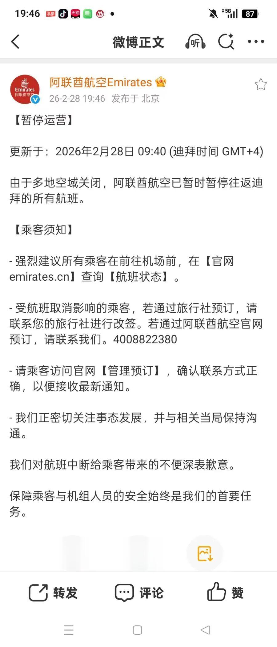 阿联酋航空在声明中表示,正密切关注事态发展,并协助受影响的乘客改签、退款或安排其他旅行方案。乘客被建议在前往机场前,务必查看官网的最新航班动态。