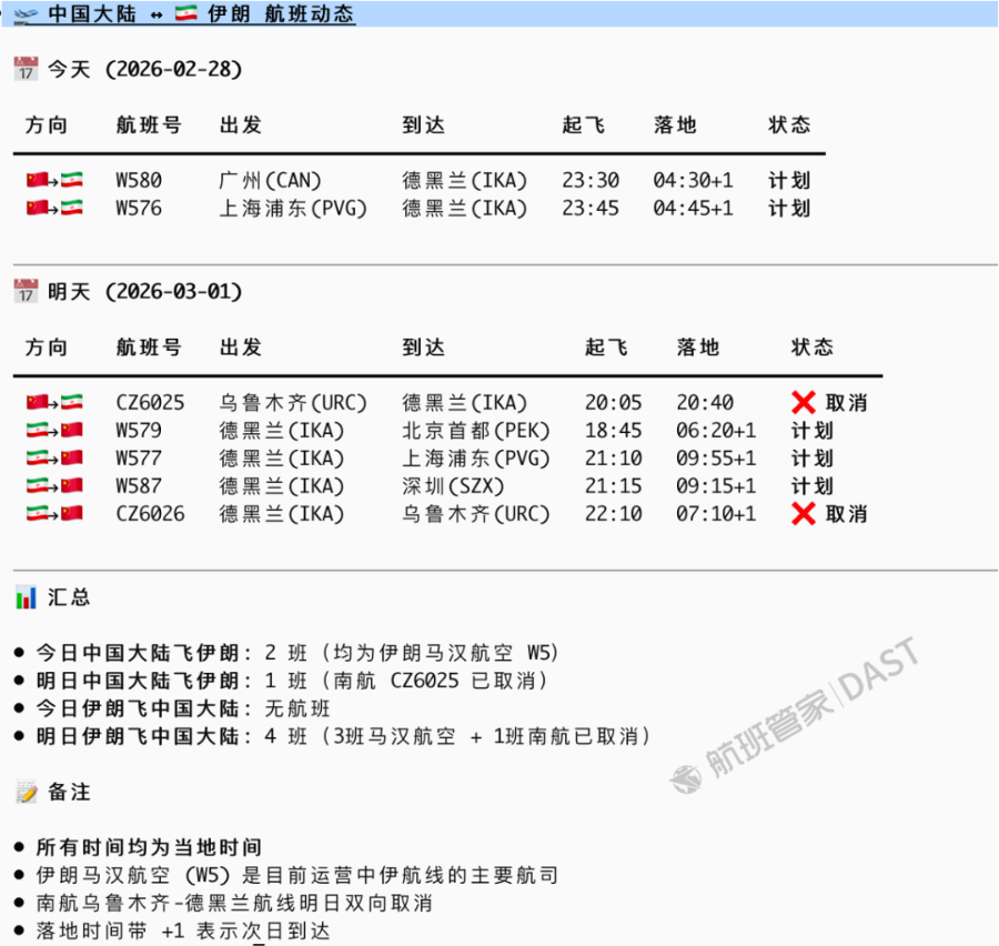 伊朗方面,截至北京时间2月28日16:40,当地时间2月28日中国大陆-伊朗航班2班次,目前为计划状态。而3月1日南航的伊朗航班已经取消,但伊朗汉马航空的航班仍在计划中,并未取消。