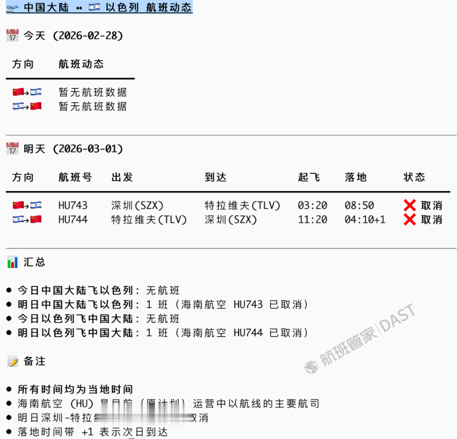 同日,以色列机场管理局称,已关闭以色列领空对民用航班的开放,呼吁公众不要前往以色列机场。管理局还表示,往返以色列的航班将在安全形势允许的情况下尽快恢复。根据航班管家DASTAI查询,2月28日中国大陆-以色列暂无航班,3月1日(当地时间)中国大陆-以色列航班已全部取消。