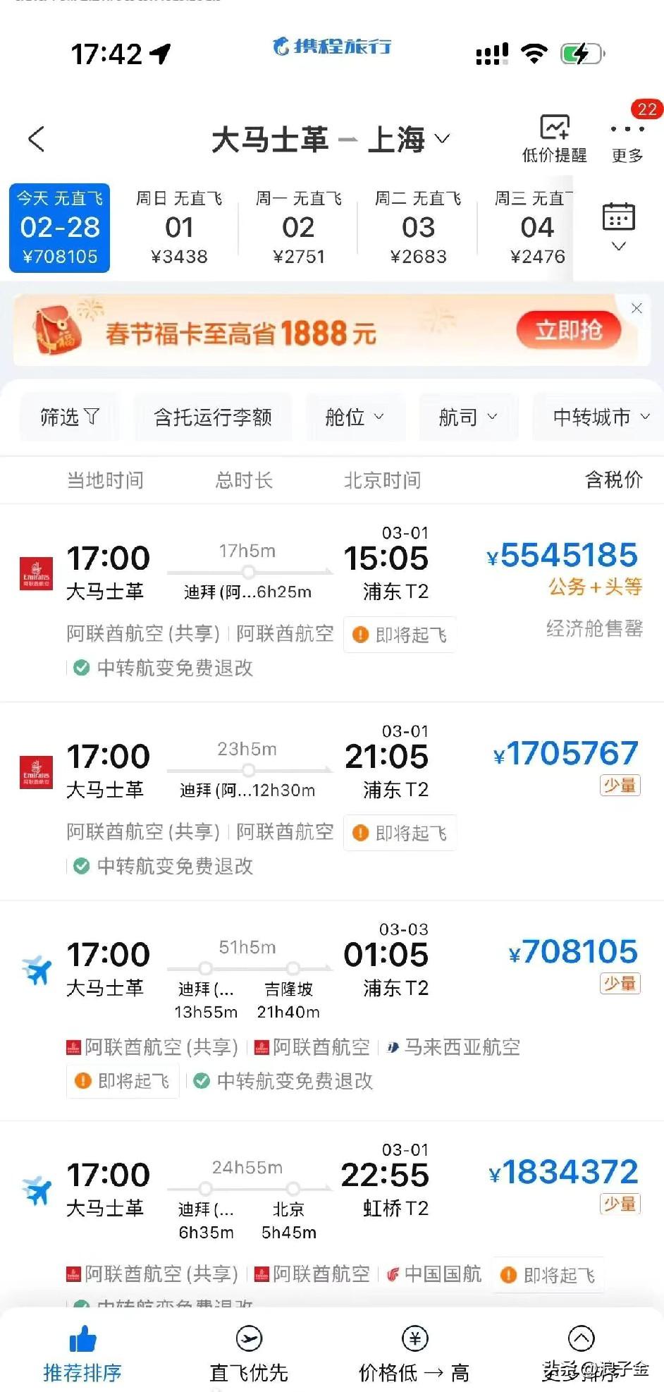 美国伊朗战争,大马士革回上海机票这么夸张了?几十万,这机票能买一套房子了吧! 很好奇为什么这么涨价,还有这飞机能飞得起来吗? 说实话 国家已提前48小时发出通知,他们为什么不提前两天买机票回来? 有人觉得查到的票价没那么夸张的,其实只需要查询有没有“即将起飞”四个字就行!飞不起来的机票当然便宜,便宜的机票有啊,就是不能飞,或者晚点飞! 有网友感叹,这辈子活得,连张机票都买不起了! 真应了那句话,灾难时期,是普通人上不了诺亚方舟的原因找到了,关键时候一张票能救命!