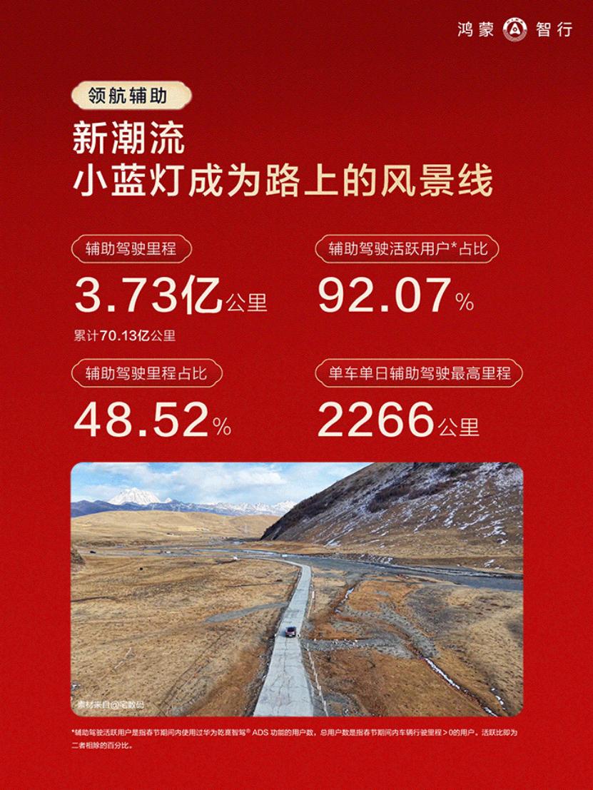 春运报告背后,是鸿蒙智行对“长尾场景”的持续深耕 新春返乡大考见真章,鸿蒙智行春节辅助驾驶出行报告重磅发布,以百万用户的真实出行数据,彰显了鸿蒙智行辅助驾驶技术的硬核实力与行业标杆地位。 报告核心数据显示,春节期间鸿蒙智行辅助驾驶活跃用户占比达92.07%,春节期间辅助驾驶总行驶里程3.73亿公里,累计已达70.13亿公里!此次 OTA 升级后的 NCA 功能实现了山区、乡村场景的全功能覆盖, ADS 融合感知技术让车辆精准识别无划线、碎石、坑洼等复杂路况,途灵平台则实现毫秒级车身姿态调控,做到 “路未至,身已调”。 针对春运返乡用户 “山路怕接管、雨雪怕打滑、长途怕疲劳” 的核心痛点,鸿蒙智行辅助驾驶实现了恶劣天气下的安全防护、长途驾驶的疲劳缓解,让每一段返乡路更安心。这不仅是技术的突破,更是鸿蒙智行推动辅助驾驶渗透城乡出行的重要一步,为行业划定了本土路况适配的新标准。