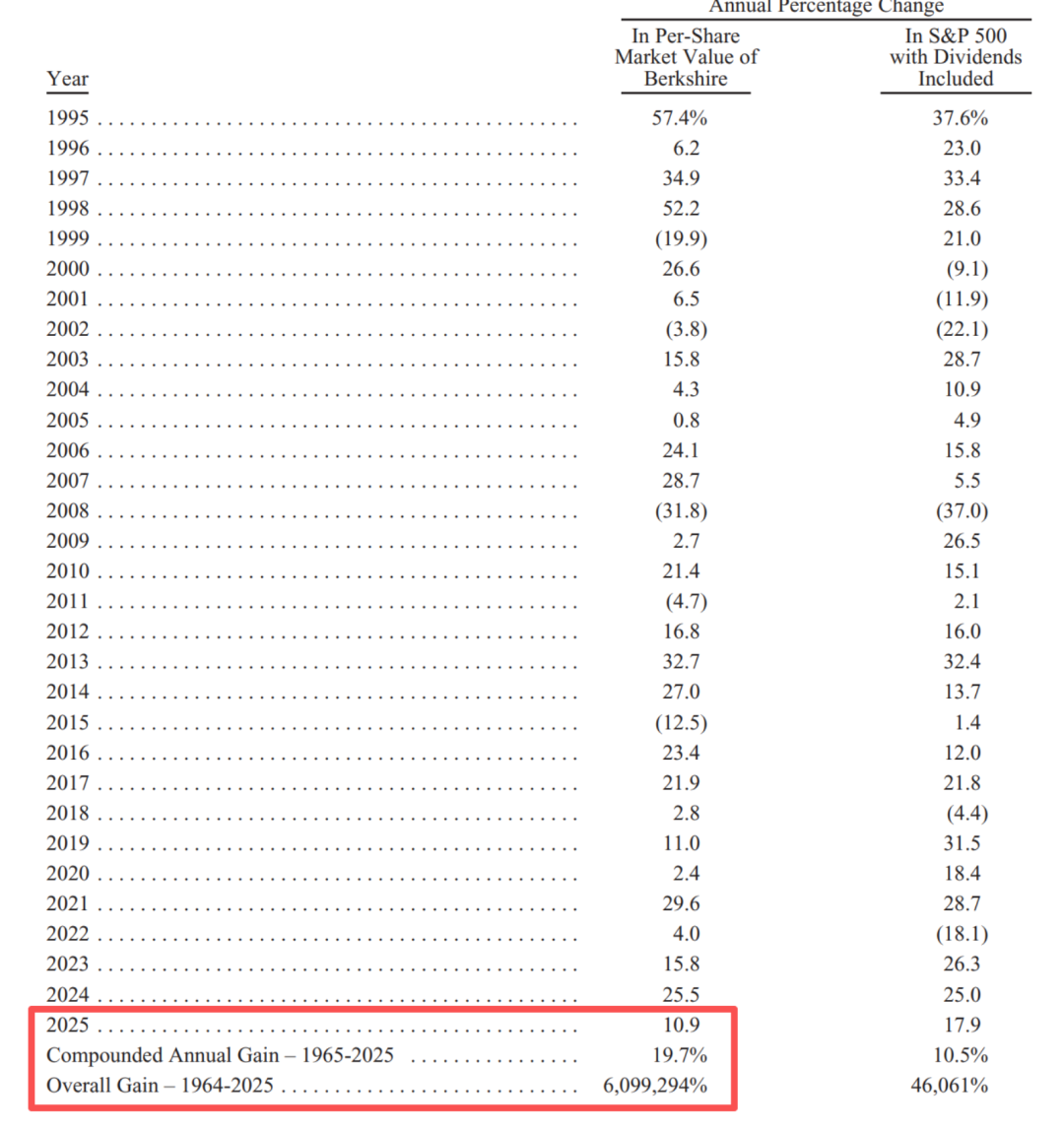 伯克希尔哈撒韦于周六晚间披露业绩,2025年,伯克希尔每股市值的增幅为10.9%,标普500指数为增长17.9个百分点。