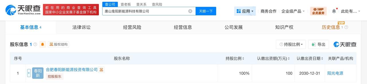 阳光电源在唐山成立新能源科技公司 注册资本100万 天眼查App显示,近日,唐山龛阳新能源科技有限公司成立,法定代表人为杨成,注册资本100万人民币,经营范围含太阳能发电技术服务、节能管理服务、风力发电技术服务、合同能源管理、光伏发电设备租赁、智能输配电及控制设备销售等,由阳光电源旗下合肥春阳新能源投资有限公司全资持股。 天眼查信息:
