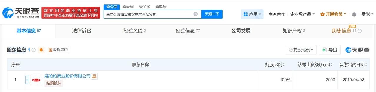 南京娃哈哈宏振饮用水公司注销 天眼查App显示,近日,南京娃哈哈宏振饮用水有限公司登记状态由存续变更为注销。 该公司成立于2015年1月,法定代表人为盛文龙,注册资本2500万人民币,经营范围包括食品的生产和销售,食品用塑料包装容器、工具、制品的生产和销售等,由娃哈哈商业股份有限公司全资持股。 天眼查信息: