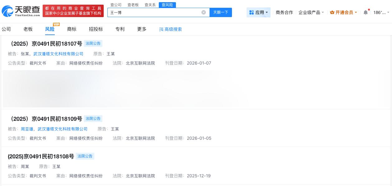 王一博近期多次告黑 王一博多次维权胜诉库迪向王一博致歉 近日,乐华娱乐针对网络平台账号散布艺人王一博的诽谤内容发布严正声明,称相关内容为恶意诽谤,已启动法律程序追责。 天眼查法律诉讼信息显示,近期,王一博已多次发起网络侵权责任纠纷,被告涉及多个自然人及公司。其中,周某被法院公告送达民事判决书,法院判决被告周某在其涉案小红书账号赔礼道歉,并赔偿王一博经济损失2万元。此外,黄某被判向王一博公开道歉,赔偿经济损失(含维权合理支出)5万元。 天眼查信息:王一博