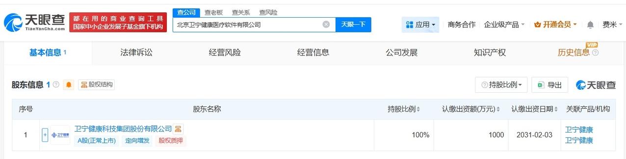 卫宁健康在北京成立医疗软件公司 注册资本1000万 天眼查App显示,近日,北京卫宁健康医疗软件有限公司成立,法定代表人为王长杰,注册资本1000万人民币,经营范围含软件开发、信息系统集成服务、信息技术咨询服务等,由卫宁健康(300253)全资持股。 天眼查信息: