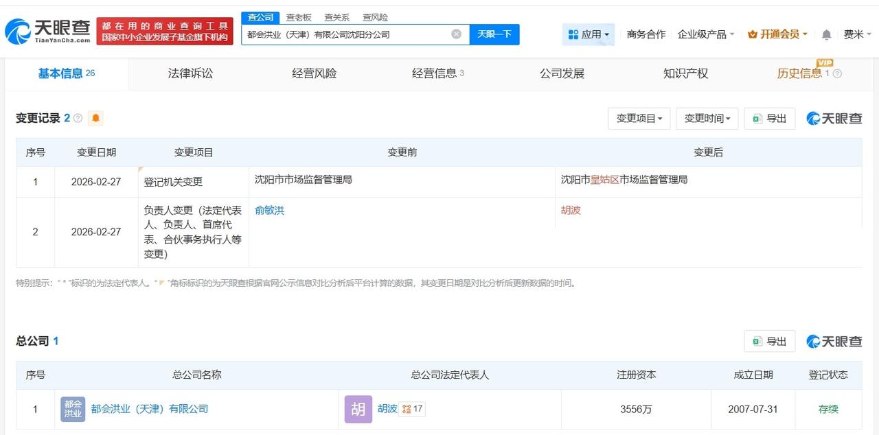 俞敏洪卸任都会洪业沈阳分公司负责人 天眼查工商信息显示,近日,都会洪业(天津)有限公司沈阳分公司发生工商变更,俞敏洪卸任该公司负责人,由胡波接任。 该公司成立于2016年9月,经营范围包括工程咨询、投资咨询、企业管理及商务信息咨询等,其总公司为都会洪业(天津)有限公司。值得一提的是,此前,俞敏洪已卸任都会洪业(天津)有限公司法定代表人。 天眼查信息: