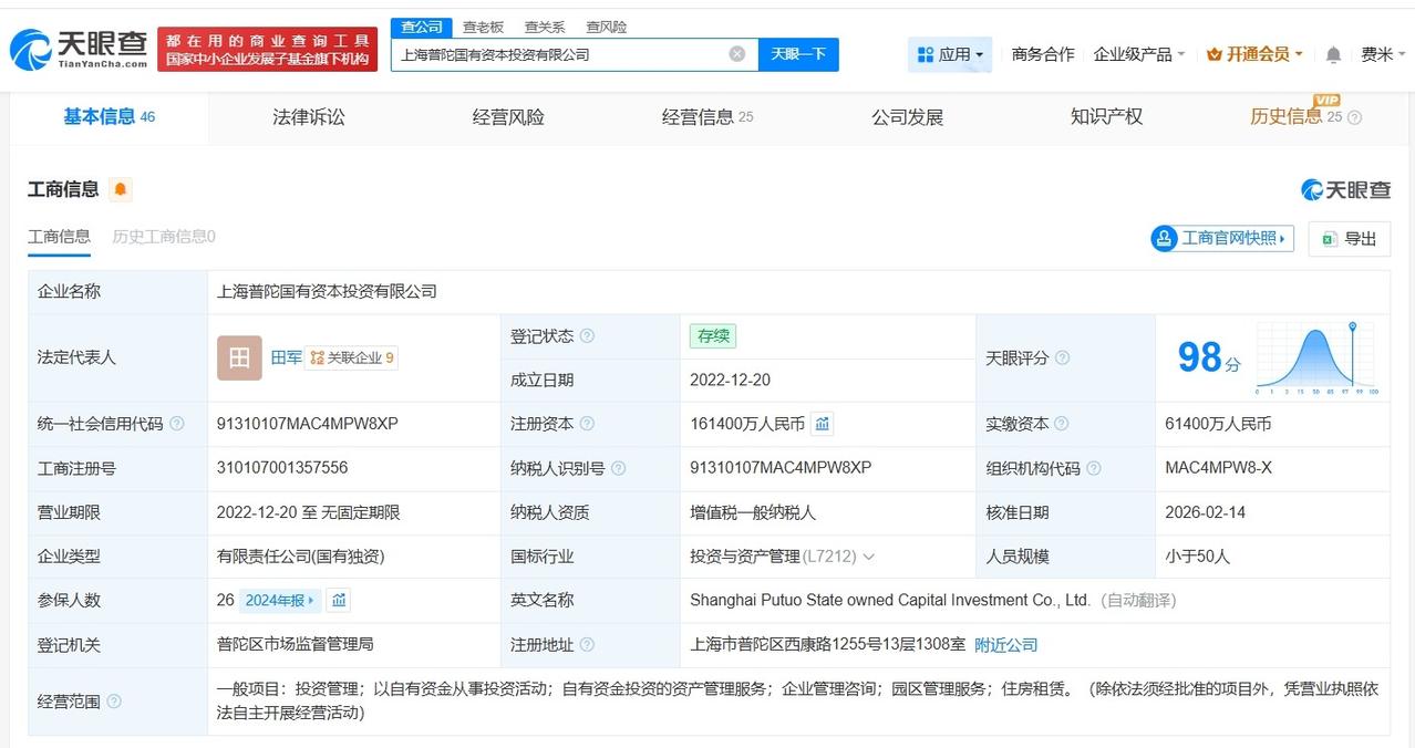 上海普陀国有资本投资公司增资至16.14亿 增幅61.4% 天眼查App显示,近日,上海普陀国有资本投资有限公司发生工商变更,注册资本由10亿人民币增至16.14亿人民币,增幅61.4%。 该公司成立于2022年12月,法定代表人为田军,经营范围包括投资管理、以自有资金从事投资活动、自有资金投资的资产管理服务等,由上海市普陀区国有资产监督管理委员会(上海市普陀区集体资产监督管理委员会)全资持股。 天眼查信息: