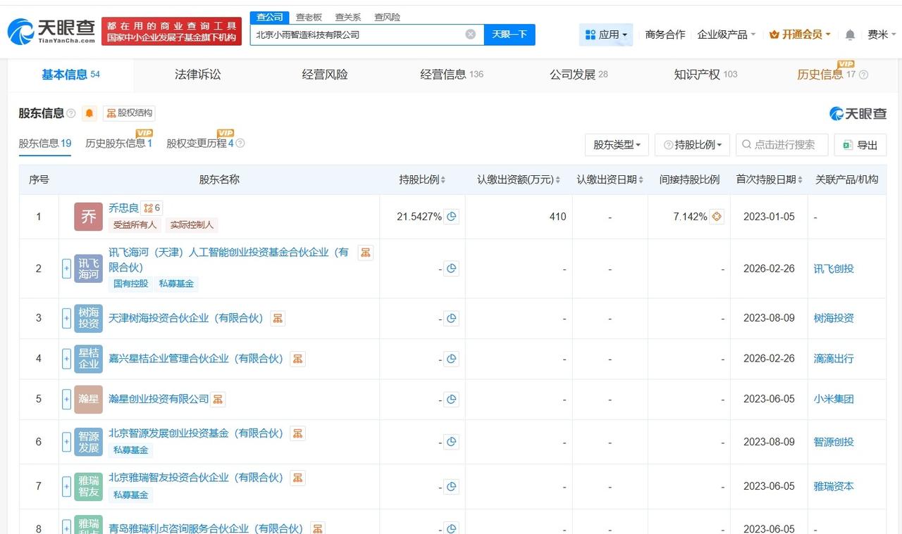 茅台旗下基金等入股具身智能机器人公司小雨智造 天眼查App显示,近日,北京小雨智造科技有限公司发生工商变更,新增茅台(贵州)高质量成长股权投资合伙企业(有限合伙)、福建省招赢数字股权投资基金合伙企业(有限合伙)等为股东,同时注册资本由约1714.6万人民币增至约1903.2万人民币。 该公司成立于2023年1月,法定代表人为乔忠良,经营范围含工业机器人制造、工业机器人销售、智能机器人的研发等,现由乔忠良、瀚星创业投资有限公司及上述新增股东等共同持股。公开资料显示,该公司致力于打造“一脑多形”的具身智能机器人。 天眼查信息: