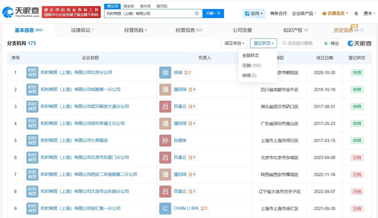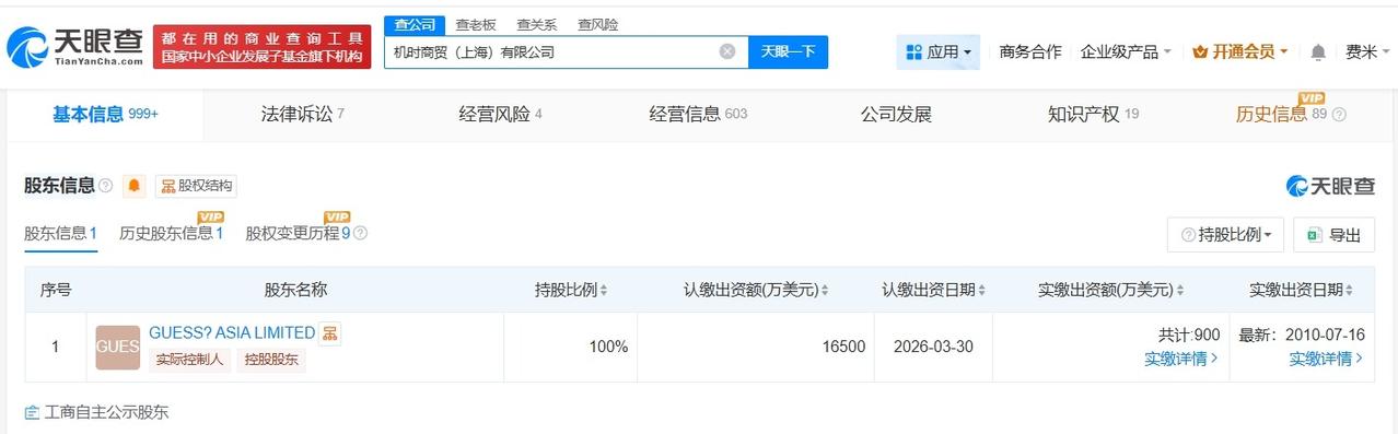 Guess中国超百家分支机构已注销 Guess中国去年完成两次增资 Guess中国商业版图盘点GUESS将关闭中国市场所有门店 据媒体报道,近日,不少消费者收到美国知名时尚品牌GUESS的官方通知短信,消息显示因经营模式调整,GUESS全国所有线上、线下店铺将在3月底前正式关闭,未来将以全新模式深耕中国市场。 天眼查App显示,GUESS中国关联公司机时商贸(上海)有限公司成立于2007年2月,法定代表人为徐斌,注册资本1.65亿美元,经营范围包括服装、鞋帽、手表、香水、眼镜、皮具及皮制品、箱包、配饰、珠宝的批发、零售、进出口和佣金代理及相关业务咨询等,由GUESS ASIA LIMITED全资持股。变更记录信息显示,去年6月和12月,该公司曾两度增资。分支机构信息显示,该公司拥有超170家分支机构,目前仅5家处于存续状态,其余分支机构均已注销。 天眼查信息: