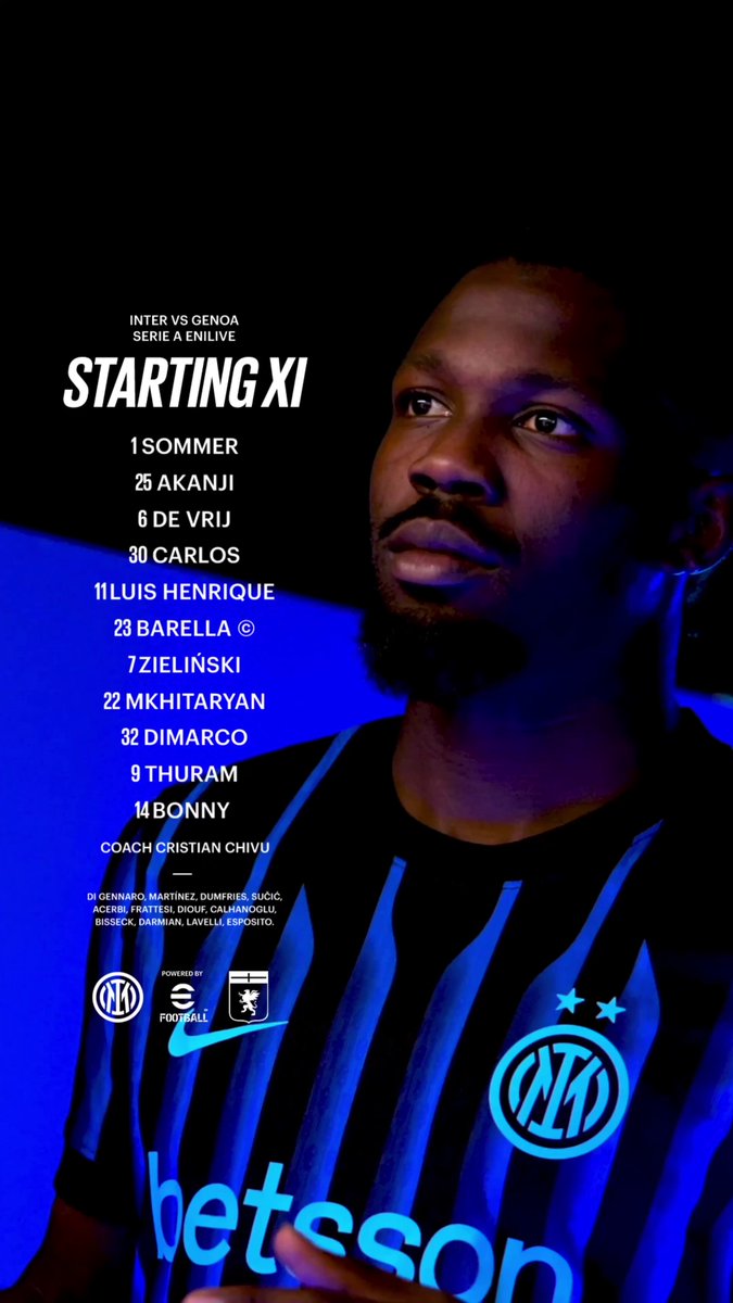 国际米兰首发:1-索默、25-阿坎吉、6-德弗里、30-奥古斯托、11-恩里克、23-巴雷拉、7-泽林斯基、22-姆希塔良、32-迪马尔科、9-图拉姆、14-博尼