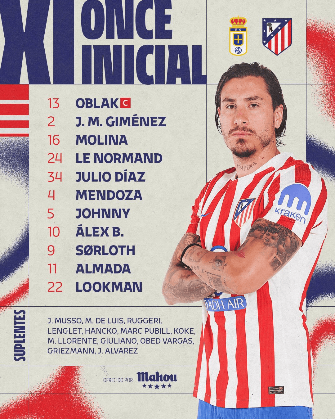 马德里竞技首发:13-奥布拉克、2-希梅内斯、24-勒诺尔芒、16-莫利纳、34-胡里奥-迪亚斯、11-阿尔马达、5-卡多索、4-罗德里戈-门多萨、10-巴埃纳、9-瑟洛特、22-卢克曼