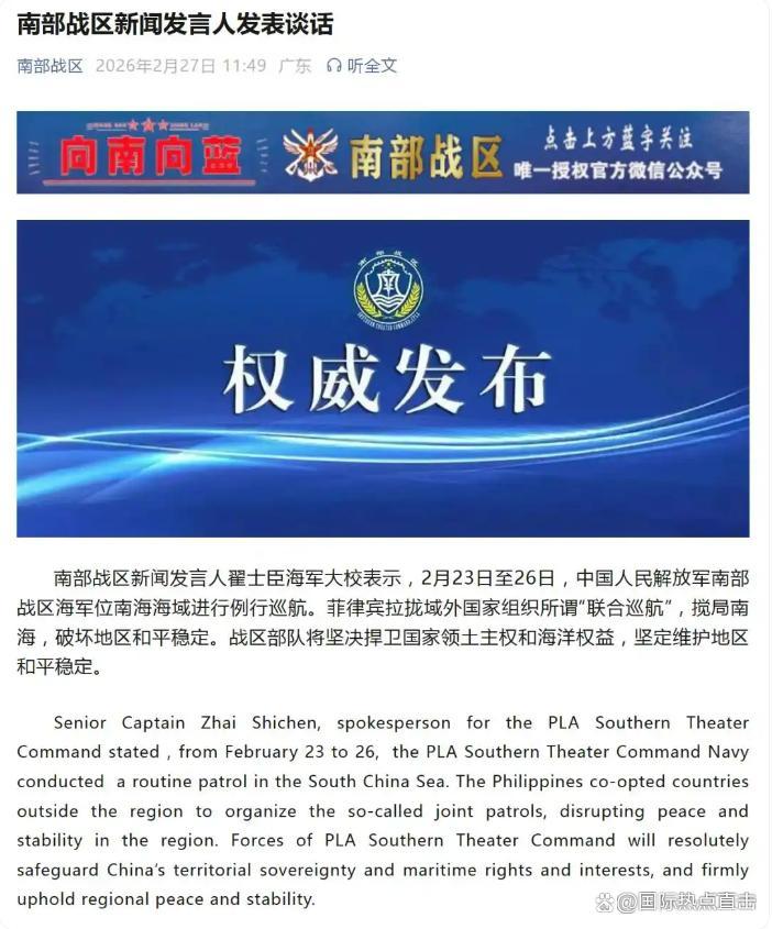 3月1日,据央视新闻直播间报道,昨天,国防部发言人张晓刚大校就近期菲律宾拉拢域外国家搅局南海一事表示,中国🇨🇳军队始终保持高度戒备,坚决反制任何侵权挑衅行为,绝不让任何祸乱南海阴谋得逞,维护好南海和平稳定。 评论,菲律宾是南海的祸根,引狼入室,应该对菲律宾亮剑,让挑衅者付出沉重的代价,杀鸡给猴看。