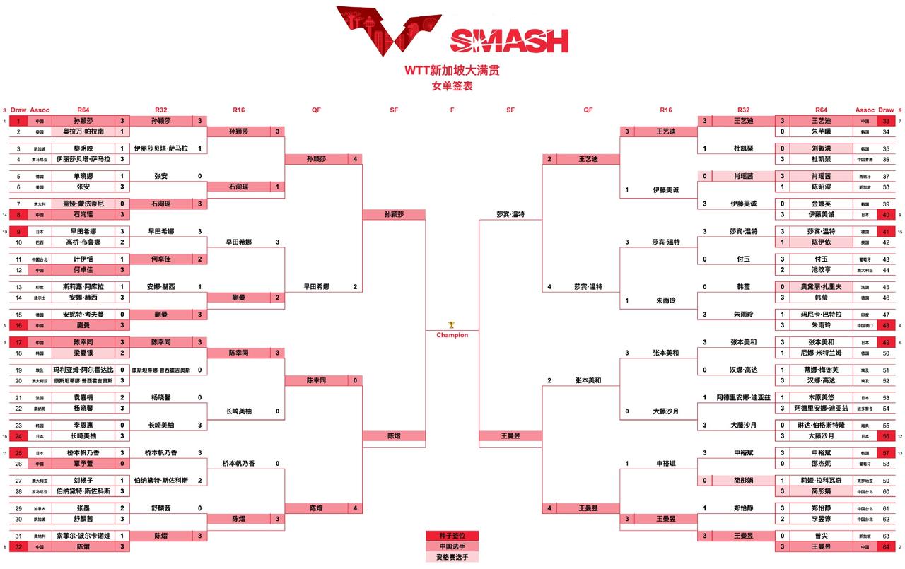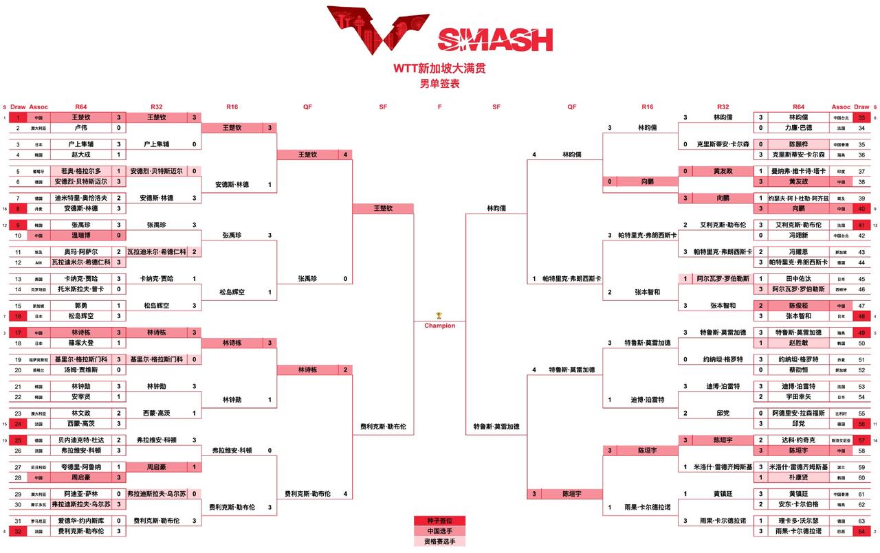 新加坡大满贯赛3月1日赛程 3月1日,WTT新加坡大满贯赛收官之日,今天共有6场比赛:4场单打半决赛,2场决赛。午间场12:00开始半决赛,晚间场19:00开始决赛。 午间场第一战反胶战防弧:王曼昱对沙滨·温特。德国一姐沙滨温特一路战雨玲逐艺迪,闯进四强不容易,半决赛面对王曼昱,看看沙滨温特的防弧胶能不能挡住王曼昱的攻击? 第二战国乒内战:孙颖莎对陈熠。陈熠气势如虹呀,特别是3:0横扫桥本帆乃香,4:0零封陈幸同,打得霸气。陈熠曾经在美国大满贯赛1/8决赛上赢过孙颖莎,今天再战世乒一号,陈熠也有胜机。 第三战左右反手攻体系对右手正手攻体系:林昀儒对莫雷加德。左手将林昀儒反手攻所向披靡;莫雷加德正手强攻,反手侧切,花样百出变化多端。今天看看到底是林昀儒一招鲜吃遍天,还是莫雷加德玩得花? 第四战压轴之战:王楚钦战费利克斯。费利克斯的快真是无处不在,发球快,进攻快,衔接快,两人目不暇接。看今天大师兄王楚钦能不能替小石头撑腰复仇? 晚间场两场决赛待定。详细情况参看下图。