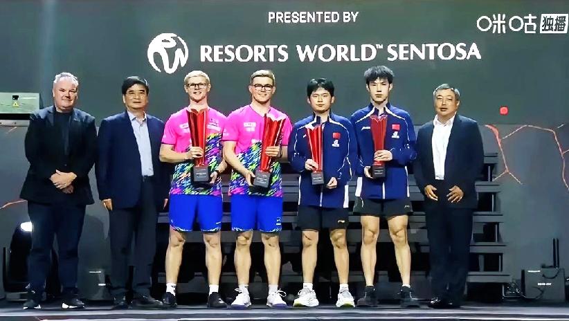 刘国梁惊现男双颁奖典礼, 主动让位运动员站中间。 网友神评, 新满混双冠军是情侣, 女双冠军是“仇人”, 男双冠军是兄弟。 新加坡大满贯, 混双冠军:雨果/高桥布鲁娜 混双亚军:林钟勋/申裕斌 女双冠军:张本美和/早田希娜 女双亚军:长崎美柚/申裕斌 男双冠军:大布/小布 男双亚军:林诗栋/黄友政 看来网友的神评还是很到位的, 总结的很是形象。 没想到刘国梁出现在男双颁奖仪式上, 林诗栋和黄友政小跑上台和刘国梁握手, 刘国梁还让他们站中间, 自己则站在侧面合影。 这次新加坡大满贯双打冠军, 真的是百花齐放、百花争艳。 (图片源自于网络)