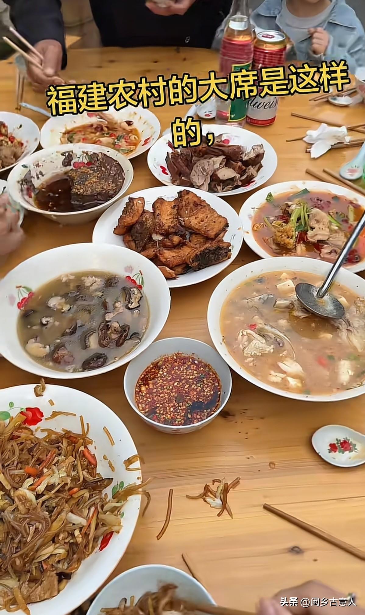 原来福建酒席也很普通,并没有网上说的那么夸张,什么澳龙、帝王蟹是标配,一桌至少好几千块钱。 福建一个网友分享的农村酒席(图1至图3),评论区的很多福建网友质疑,在他们那没见过这样的酒席。 点进发视频的人看了一下,她初四还在莆田,酒席发出来后的另一个视频在武夷山。 从酒席连小海鲜都没有,还有辣椒,可以判断出来,这个酒席举办的村很可能就是属于南平。 看多了一些福建网友所发的海鲜酒席,有些人就觉得福建酒席都那么豪横,其实在莆田,现在也有很多一桌几百块钱的酒席,土豪酒席占比还是很少的。