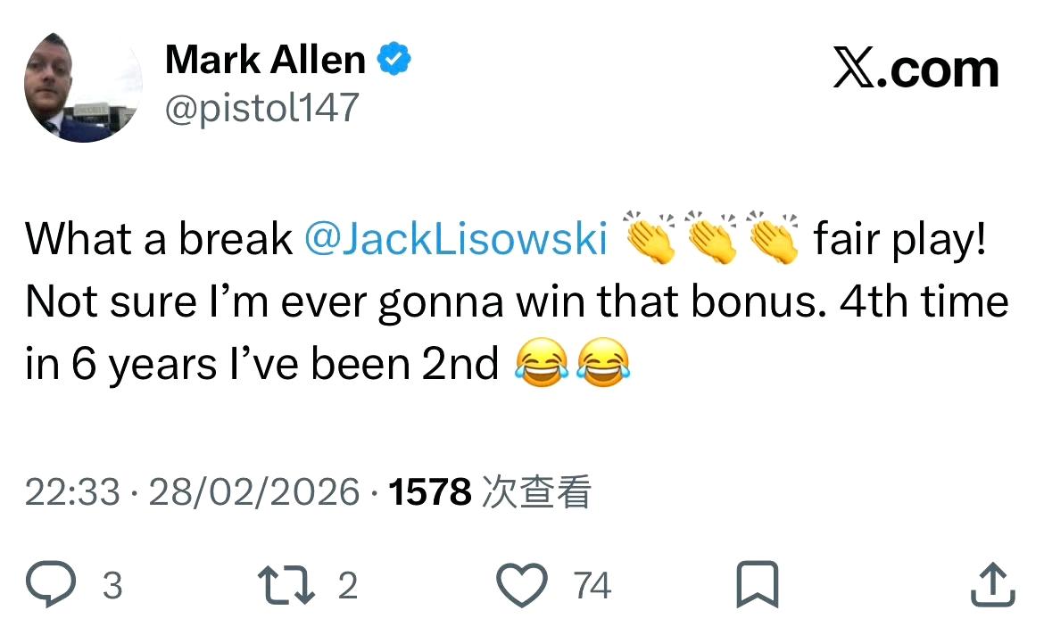 依旧无缘15万英镑,6年里4次第二!马克·艾伦刚才在利索夫斯基超分后在社媒上写道: “杰克·利索夫斯基这杆打得太漂亮了 👏👏👏 服了!看来我这辈子可能都拿不到那个奖金了。6年里第4次拿第二名了 😂😂”