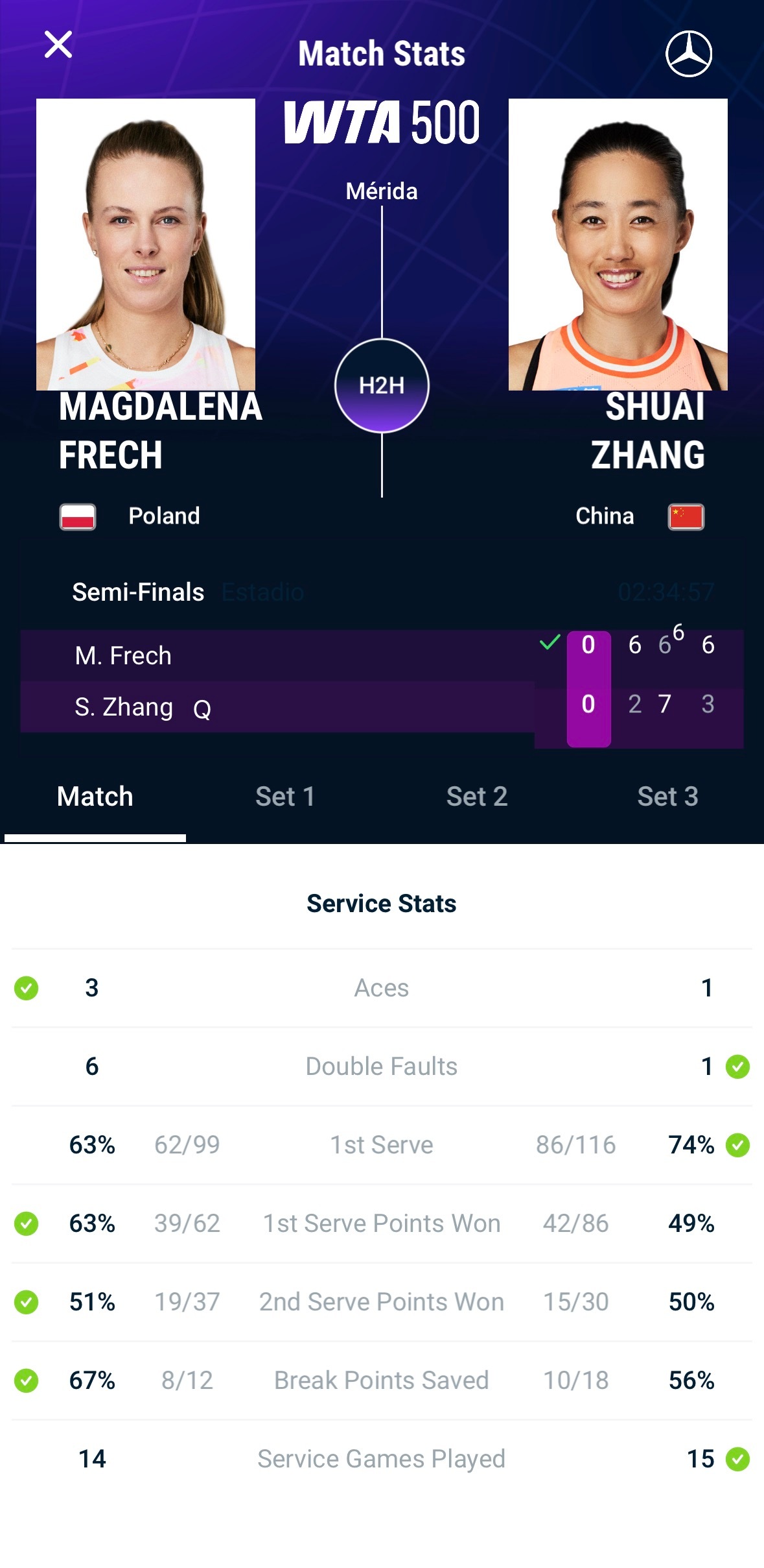 WTA500梅里达半决赛,张帅最终2-6、7-6、3-6不敌弗雷希,对手这种借力