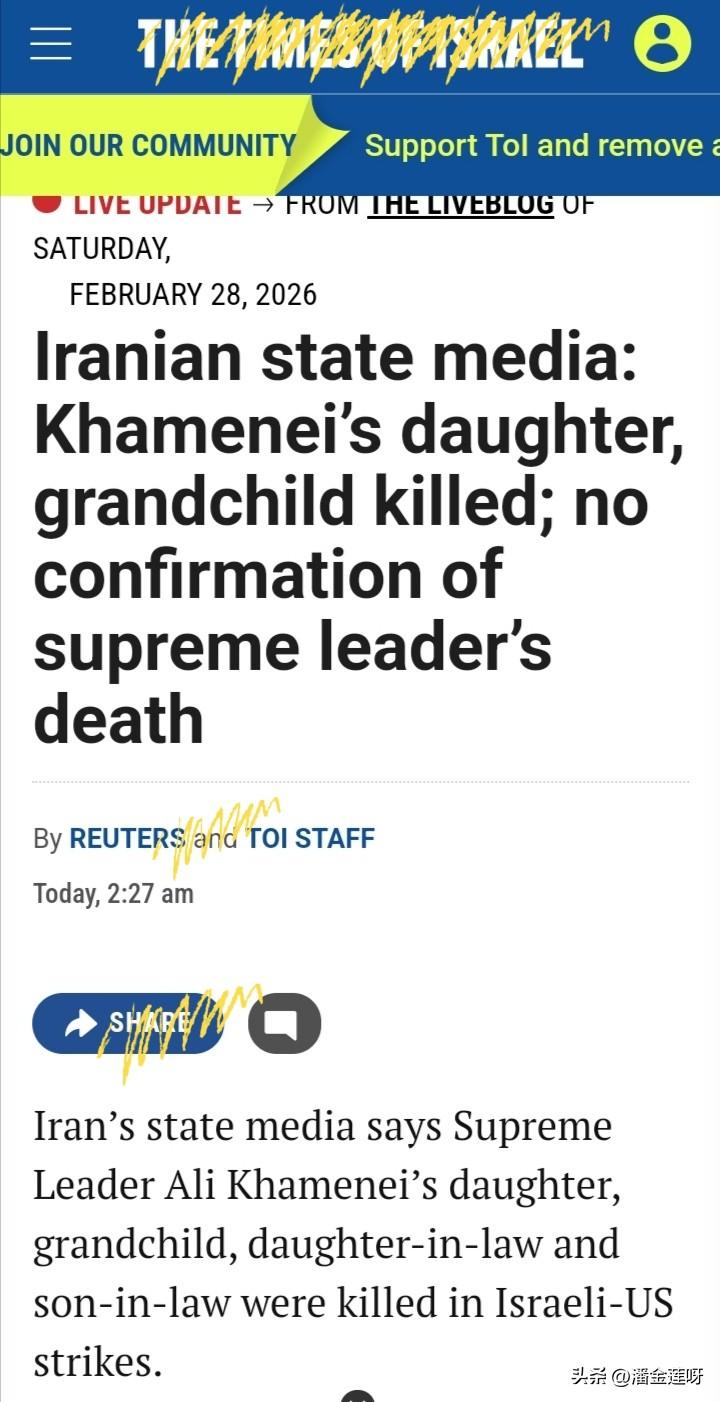 这是以色列官方媒体《以色列时报》的关于伊朗最高领袖哈梅内伊的信息。 关于哈梅内伊的生死目前的信息太多。 这条新闻和刚才发布的新闻对照着看就行。 我就说这么多,尊重基本事实,绝无情绪与立场,包括攻击。 哈梅内伊 伊朗