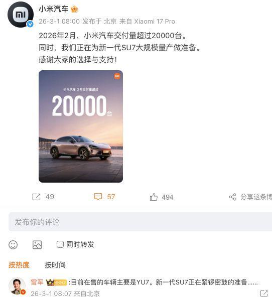 目前,小米汽车在售的车型有两款,分别为小米SU7、小米YU7。官方数据显示,2025年,小米汽车累计交付量超41万辆。3月1日,小米汽车公布的最新数据显示,2026年2月,小米汽车交付量超过2万辆。小米汽车方面表示,公司正在为新一代SU7大规模量产做准备。