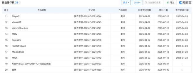 《每日经济新闻》记者查阅天眼查发现,早在去年7月,小米汽车科技有限公司就完成了多项美术作品的著作权登记,涉及名称包括XiaomiVisionGTConcept、VisionGT以及Xiaomi-Star-Axis等。这一系列知识产权布局,被业内视为小米汽车在为其VisionGT概念车的正式亮相提前“铺路”。