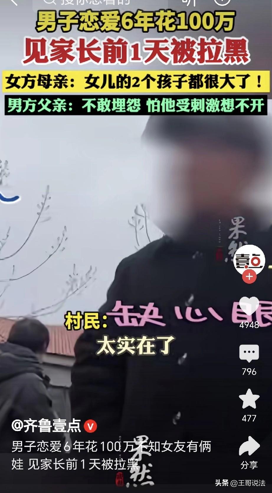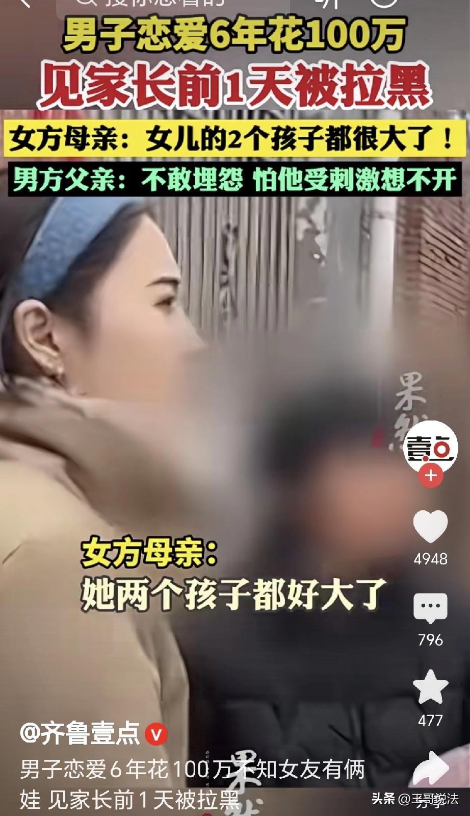“这脑子,哪来的一百多万?”河南,一30岁男子谈了个女友,恋爱6年,给女方花100万,过年的时候,男子想见女友父母,可大年初四,女子说她父母不同意见面,女友提出分手并拉黑他,男子急了,到女友家讨说法,女友妈妈: 我女儿都结婚了,她两个孩子都好大了,村民: 他是不是有点缺心眼儿啊? 王先生是96年生人,他大学毕业,就出去打工,他希望用自己的双手,挣来财富,他辛勤工作,挣来的钱全都存住。 在他心里,他希望成家立业,可要成家,手里先要有一部分资金。 因为他知道,想谈恋爱,没有钱不行,钱是底气,没钱抠抠搜搜,没有哪个女孩子会正眼瞧你。 可是不经意期间,爱情来临,他在上班的工厂内,遇到了一位心仪的女孩子。 他大喜过望,这女孩子长相秀丽,可爱温柔,正是他最最喜欢的女子类型。 他用尽了全部的真心,对待女孩尽心尽力,他不但付出了真心,他还拿出来实打实的财力。 他和女孩,一直在爱情的路上长跑下去,转眼6年,他从24岁,一直到了今年的30岁了。 在这期间,他给女友连花带借,一共给她花了100多万,他原本以为,这些钱已经足够能表达出他的诚意。 他们相处已久,王先生以为,他们的婚事已成定局,在这6年期间,小打小闹,他给女友花了不少的钱。 到了后来,女友说母亲有病,张口就问他要大钱,男子掏空了积蓄,倾尽所有给她了一切。 之后不久,女子又说自己患病,要做手术,这又是需要一笔巨款,男子万不得已,跑去给她贷款借钱。 再到后来,女友回了老家,他们很久都没能见面,而男子心心念念,始终牵挂着女友的心不变。 他着急结婚,希望先把婚事一订,这样虽然俩人暂时不在一起,但是订婚能让他感到特别的安心。 女友爽快,她二话不说,决定和他进行一场网络订婚,王先生认为,不管什么形式,只要订婚他就会满心的高兴。 可女友又借此为由继续问他要钱,王先生豁了出去,筹集资金又给她转了过去。 到了今年,王先生觉得自己的年龄已经30岁了,已经到了该结婚的年纪。 他和女友商量,俩人说好过年的时候去见女友的父母,见完之后,就会安排俩人之间的婚事。 他满心的欢喜,各种准备的采买礼物,他觉得又是过年,又是第一次见面,他一定要做到礼貌而又隆重。 他买好了礼品,问女友是否满意,女友满口答应,同时也表现的十分高兴。 可是到了初四这天,女友突然发来了消息,王先生打开一看,女友提出,要和他分手。 王先生惊呆,以为女友在闹脾气,他急忙给她回消息,想问问她是怎么回事。 谁知他这才发现,女友把自己给拉黑了,他消息发不出,电话打不通,女友好像突然就消失了。 男子急了,6年的感情不是6个月,也不是6天还有呢?100多万的付出。怎么可能说句分手。就能结束了 王先生立刻动身。往女友家赶去。他从没有来过。一路打听。当他一路颠簸赶到女方家里。他敲开大门,只有女方的母亲。待在家里有母亲问他怎么回事儿?王先生告诉他自己是他未来的女婿。女子母亲露出差异的眼光。觉得这小伙子似乎精神上有问题 王先生把来龙去脉告诉了女子母亲。女子母亲说出来的话令他晴天霹雳。 女友母亲告诉他说,我女儿都结婚了,她两个孩子都好大了! 王先生蒙圈了,这怎么可能?我们俩认识6年,谈了整整6年的恋爱,我给她花了100多万,她明明是我的女友,怎么可能和别人结婚呢? 可是事实就是如此,王先生的女友早就是别人的妻子,他不能接受这样的打击,垂头丧气回到了自己家里。 王先生的父亲得知后沉默不语,那100多万里有他几十万的积蓄,还有借款贷款,都成了他家的债务,儿子如此痴心,令他感到十分的无力。 可是,父亲不敢埋怨儿子,他怕儿子想不开再出意外。 但是事已至此,想和女友结婚,已经绝无可能,但是女友这种行为,分明就是诈骗。 她不但骗感情,还骗了王先生的巨额资金,女友村里的村民围观,他们也觉得这事不可思议。 有人认为,王先生是不是缺心眼呀? 也有村民感叹,说王先生大概是太实在了! 你哪能在不了解,不确定的情况下就这样给对方转这么多钱,她说的事情是否是真的,你最起码要核实一下。 那100多万普通家庭里根本就没有。更何况自己家里也就是普通的家庭。 有人认为,就这智商,他怎么有100多万,想不通呀? 更有人说,这男子缺心眼太老实,女的纯属诈骗,应该报警抓她! 《刑法》第266条规定:诈骗公私财物,数额较大的,处三年以下有期徒刑、拘役或者管制,并处或单处罚金;数额巨大的处三年以上十年以下有期徒刑,并处罚金;数额特别巨大的处十年以上有期徒刑或无期徒刑,并处罚金或没收财产。 女方隐瞒已婚育事实,以恋爱订婚,家人患病,自身手术等虚构事由,6年骗取男方100余万元,数额特别巨大,已构成诈骗。 男方应立即报警,要求对方返还资金。 对此,你怎么看?