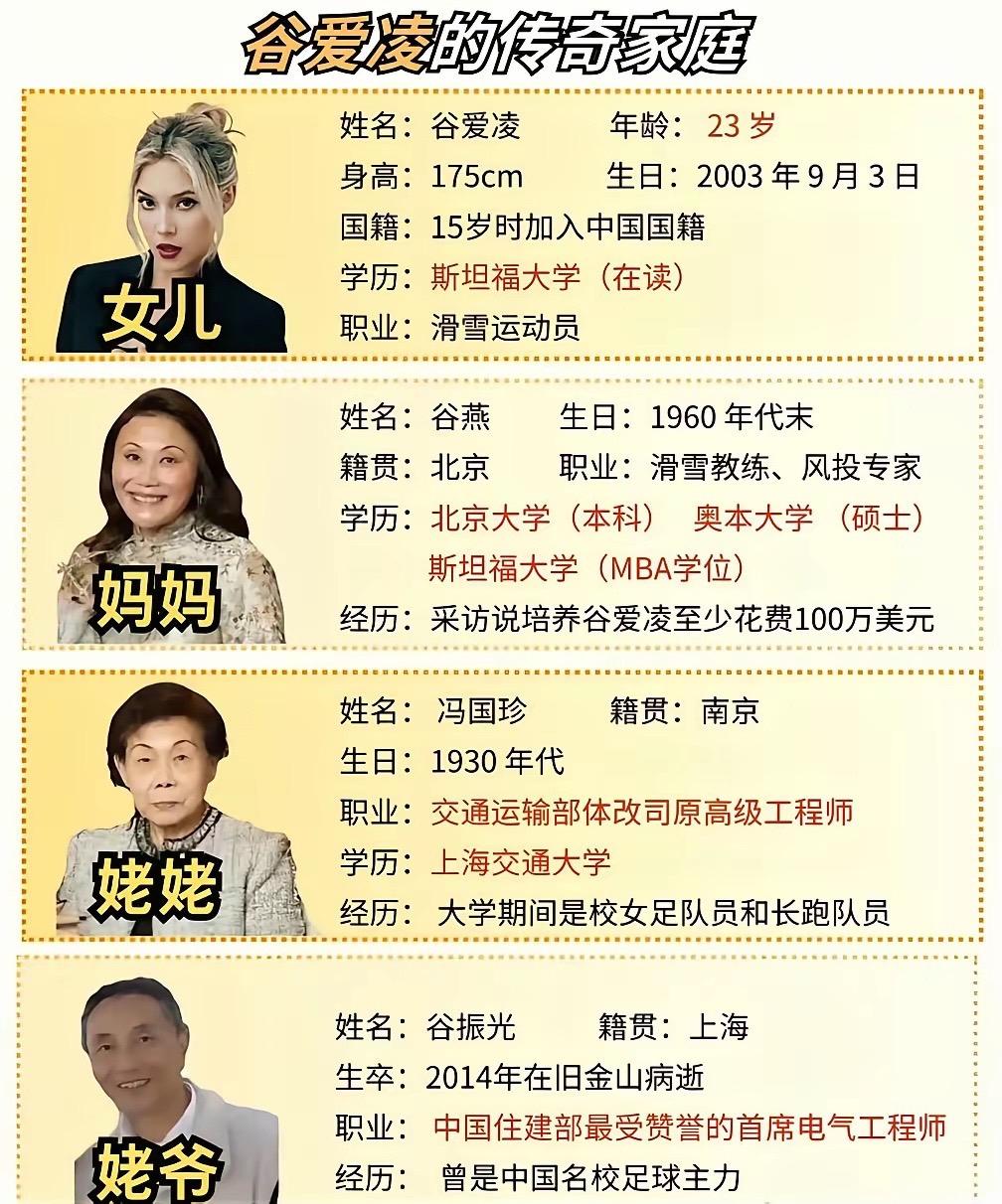 谷爱凌能一路走到今天,成为世界顶尖滑雪运动员、斯坦福学霸,背后的家庭支撑真的藏不住。很多人只看到她的天赋和努力,却没发现,她的家人每一位都是实打实的精英,堪称“神仙家族”。 先说说谷爱凌的妈妈谷燕,妥妥的全能女性天花板。她是北京大学毕业的高材生,后续还拿到了美国奥本大学生物学硕士、斯坦福大学MBA学位,还是著名生物学家沈同教授的关门弟子。 谷燕不只是学历能打,事业上更是风生水起,妥妥的企业家。早年在华尔街雷曼兄弟公司任职,曾为中国成功运作2亿美元贷款。 后来合伙创办美国科技投资有限公司,还回国创建企业,一心助力中国硅谷之梦。除此之外,谷燕还是一名滑雪运动员,早年更是北大短道速滑队队员兼滑雪教练。 谷爱凌的滑雪启蒙,最早就来自妈妈。而且她端庄大气,颜值特别出众,一点不比女儿谷爱凌逊色,气质格外出众。 再来聊聊谷爱凌的父亲,网上关于他的信息很少,目前公开的只有两点,他是美国人,毕业于哈佛大学,属于顶级学霸行列。其他相关资料一直没有公开,咱们也不瞎猜,尊重家人的隐私。 谷爱凌的外公谷振光,同样是宝藏长辈。他毕业于东北大学,才华横溢,一生深耕住房和城乡建设部相关领域,是业内备受认可的电气工程师,为行业发展做出了突出贡献。 而且他多才多艺,学生时代是名校足球主力,还擅长诗、琴、绘画,游泳、滑冰和滑雪也都很拿手。外婆冯国珍,更是上世纪的女性精英代表。 她毕业于上海交通大学,1955年就考上交大电力工程系工业企业自动化专业,那个年代能考上交大的女生寥寥无几。 毕业后,她成为交通运输部体改司高级工程师,一辈子在岗位上兢兢业业,用专业能力发光发热。 值得一提的是,冯国珍退休后前往美国照顾谷爱凌。 从小教她讲汉语、吃中餐、讲中国故事,还经常鼓励她做到最好,谷爱凌身上的自信和坚韧,离不开外婆的言传身教。谷燕还有个哥哥,也就是谷爱凌的舅舅谷海,同样是学霸级人物。 他和妹妹谷燕一样,都是北京大学的校友,北大毕业后没有停下脚步,前往美国进修深造,后续就在美国发展,在自己的领域闯出了一片天地。 可能有人会说,谷爱凌是“赢在起跑线”,这话其实没错,但更多的是家风的传承。三代人都是高知、精英,不是靠财富堆砌,而是靠知识、格局和努力,一步步积累下来的底气。 谷燕的眼界和坚韧,外公外婆的严谨和博学,舅舅的上进和优秀,都在潜移默化中影响着谷爱凌。她从小接受最好的教育,拥有最优质的成长环境。 更重要的是,家人给她的不是压力,而是支持和引导,让她能顺着自己的热爱,拼出属于自己的精彩。 说到底,谷爱凌的成功,从来不是偶然。是天赋加持,是自身拼搏,更是整个家庭的托举,这份几代人沉淀下来的优秀,才是最难得的财富。