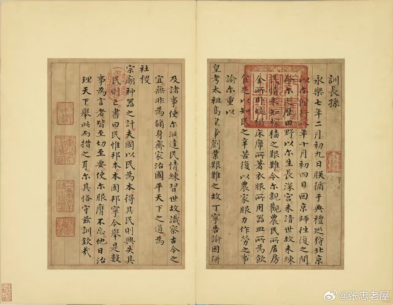 这是明成祖朱棣写给皇长孙朱瞻基的《训长孙》(出自《治平金鉴》),现藏于台北故宫博物院。右页(训长孙)训长孙永乐七年二月初九日,朕循于典礼,巡狩北京。以尔偕行八年十月初四日回京师,往复之间,野以尔生长深宫,未谙世故,未练稼穑之艰难。今尔亲观农民所居房舍、所卧炕床席、所著衣服、所用器皿、所为饮食,足以知民之辛苦。复以农家服力作劳之事谕尔,重以皇考太祖高皇帝创业艰难之故,丁宁告谕,因并及诸事,使尔洞达民情,练习世故,识察古今之宜,无非为修身齐家治国平天下之道,为社稷宗庙神器之计。夫国以民为本,得其民则兴,失其民则亡。《书》曰:“民惟邦本,本固邦宁。” 今举是数事为言者,皆至切至要,使尔服膺不忘。他日治理天下,举此而措之耳。尔其恪守兹训,钦哉!左页(社稷)社稷及诸事,使尔洞达民情,练习世故,识察古今之宜,无非为修身齐家治国平天下之道,为社稷宗庙神器之计。夫国以民为本,得其民则兴,失其民则亡。《书》曰:“民惟邦本,本固邦宁。” 今举是数事为言者,皆至切至要,使尔服膺不忘。他日治理天下,举此而措之耳。尔其恪守兹训,钦哉!