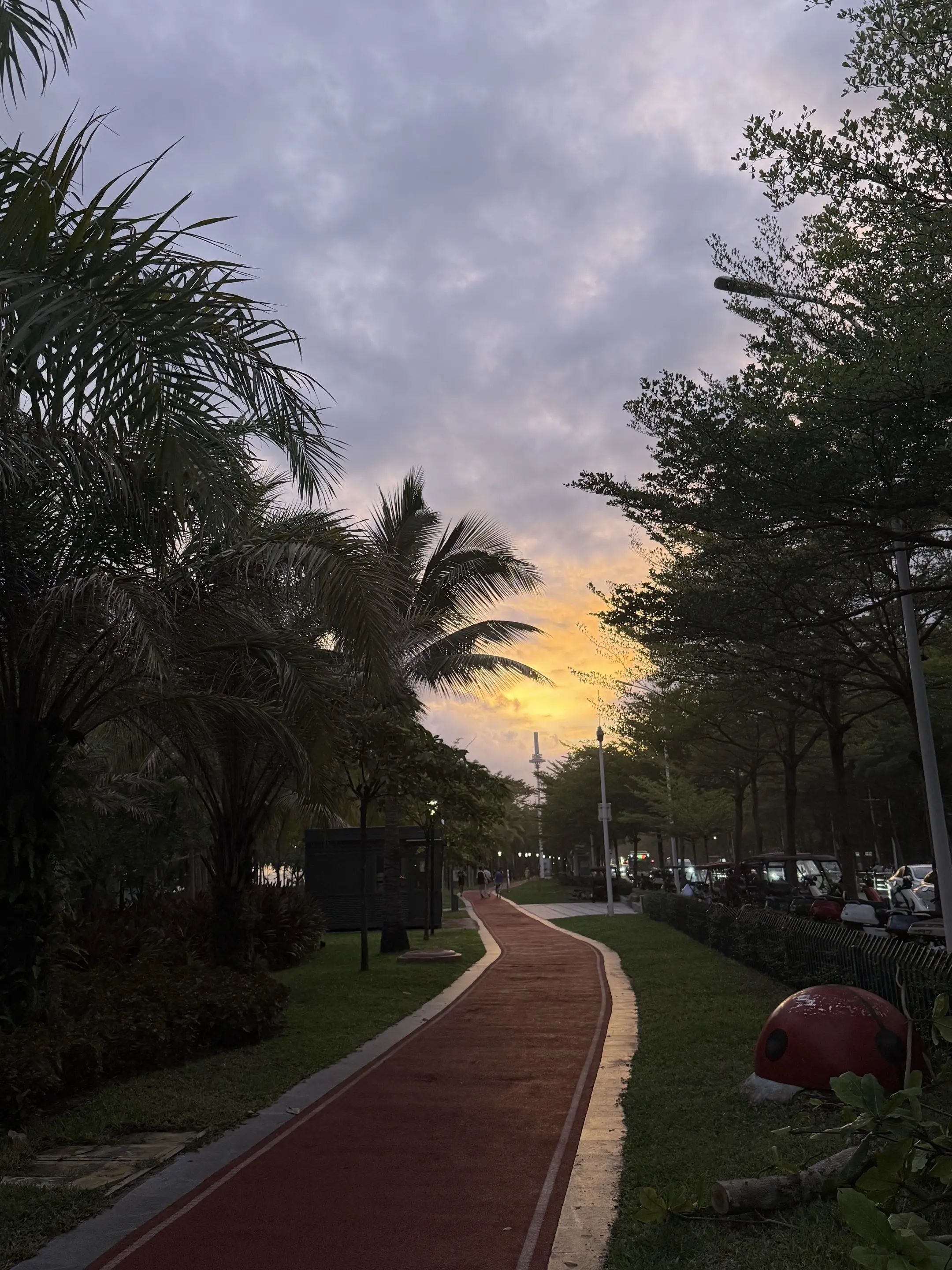 公园晨景晓色初开林影轻,翠条凝露缀晨晴。风梳密叶筛金缕,草铺软茵接远汀。