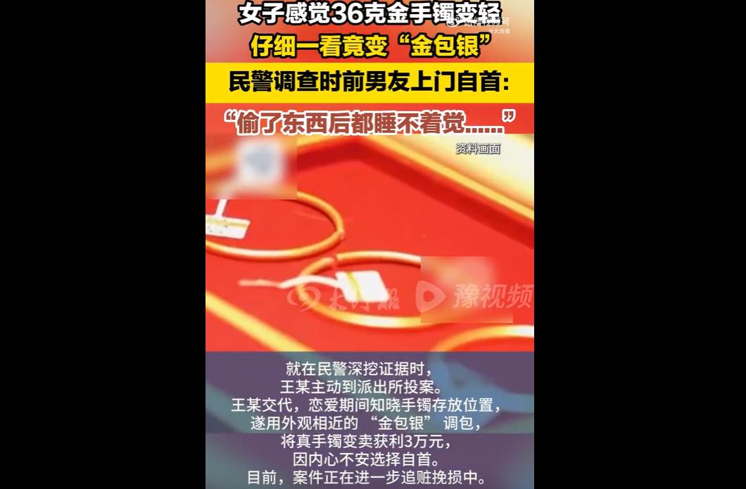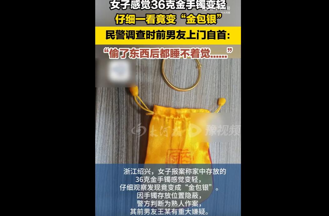近日,浙江绍兴一女子发现 36 克金手镯被调包成 “金包银” 后报警,其前男友王某因压力自首。 他因急需用钱,偷换手镯并变卖得 3 万元。 曾经的恋人,如今的窃贼;曾经的亲密,如今的算计。 男子偷换女友金手镯变卖,不仅突破了道德底线,更是赤裸裸的违法犯罪,这种行为卑劣至极,令人不齿。 36 克金镯,承载的是女子的珍视与信任,却被曾经最亲近的人看在眼里、记在心上,甚至处心积虑买来假货调包。 这哪里是一时糊涂,分明是蓄谋已久的偷窃。 他利用女友的信任与放松警惕,潜入对方最私密的生活空间,精准下手、偷梁换柱,把感情当成了可以利用的工具,把信任当成了可以践踏的弱点。 最讽刺的是,他偷的不是陌生人,而是曾经朝夕相处、毫无防备的女友。 这种背叛,比普通盗窃更伤人、更诛心。 女子失去的不只是价值三万的金饰,更是对一段感情的全部信任,对人性善意的最后期待。 这种伤害,不是一句 “急着用钱” 就能抹平的。 男子明知行为可耻,依然选择铤而走险,事后惶惶不可终日,恰恰证明他从一开始就知道自己在作恶。 自首,不过是恶行暴露、压力爆棚后的无奈选择,并非真心悔悟。 感情可以结束,人品不能崩塌;分手可以体面,做人不能无耻。 也愿每一个真心付出的人,都能擦亮双眼,远离精于算计、唯利是图的人,别让信任,成为刺向自己的一把刀。