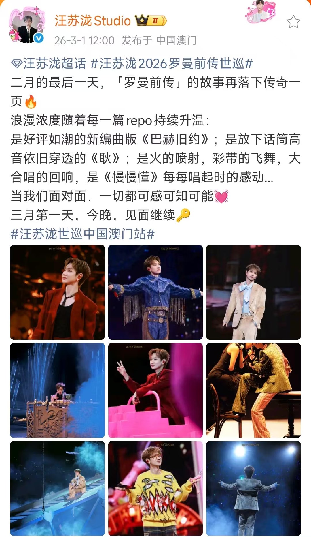 汪苏泷好评如潮的新编曲版巴赫旧约汪苏泷新编曲版巴赫旧约当汪苏泷的歌声响起,一切都可感可知可能,新编《巴赫旧约》惊艳,《耿》高音震撼,《慢慢懂》唱哭全场,火与彩带交织,二月落幕,三月澳门续写浪漫