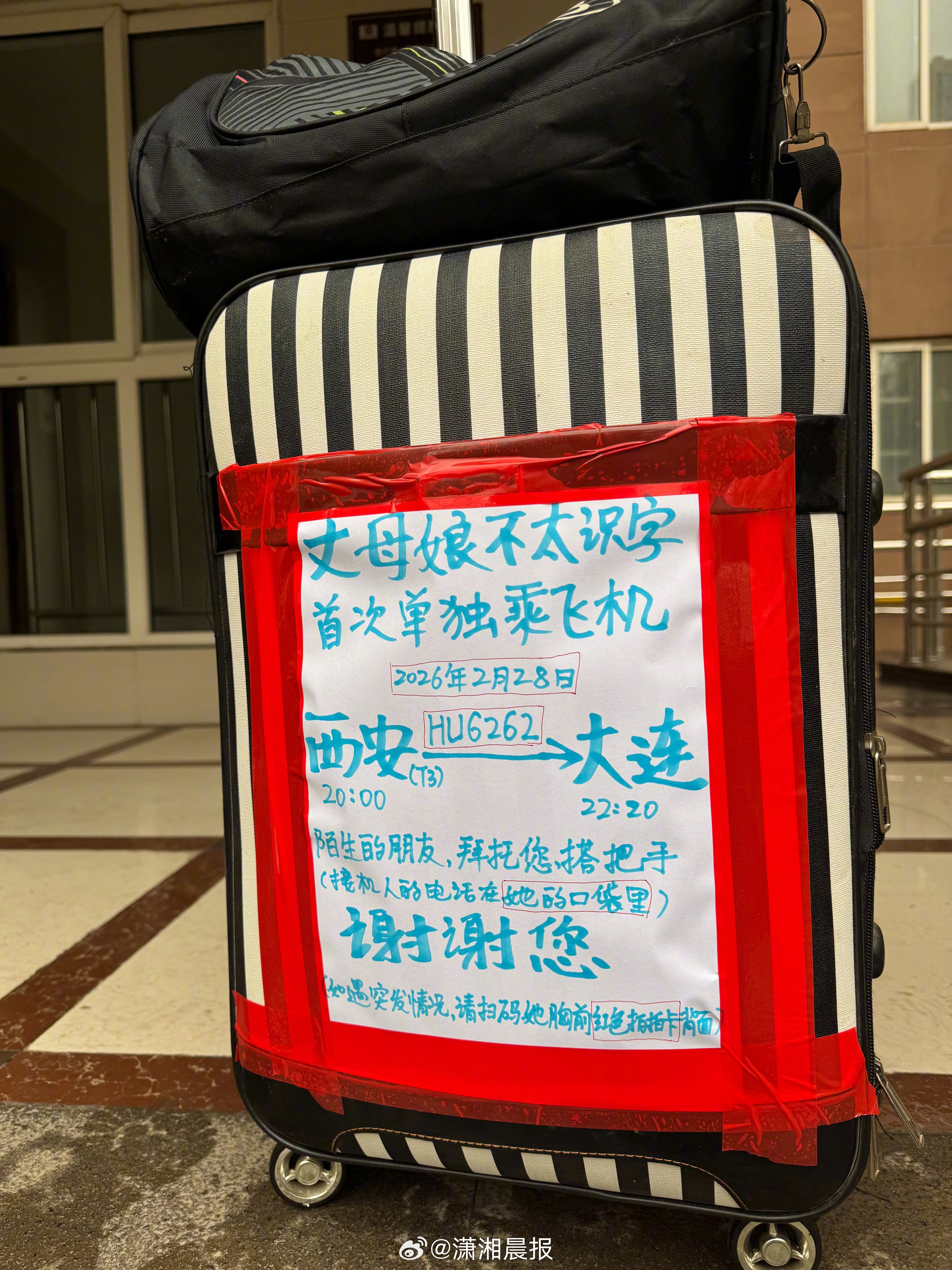 3月1日,视频发布者赵先生表示,此次是丈母娘第一次一个人乘机从西安去大连,他们也确实无法陪同,加上丈母娘不太会讲普通话,会晕机、晕车,还带了行李,家人都有些担心。后来赵先生尝试用A4纸,把丈母娘的航班信息写在上面,并贴在行李上,还在社交平台发帖,看能不能找到同班次的乘客帮忙。