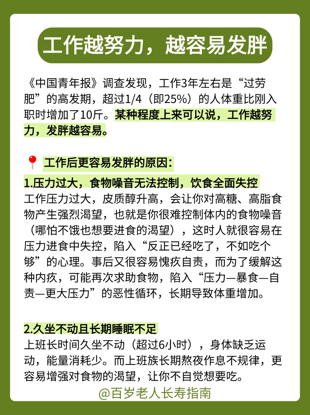 调查发现,很多人工作3年后会比初入职场时胖10斤左右,而且工作越是努力,往往人就越胖~
