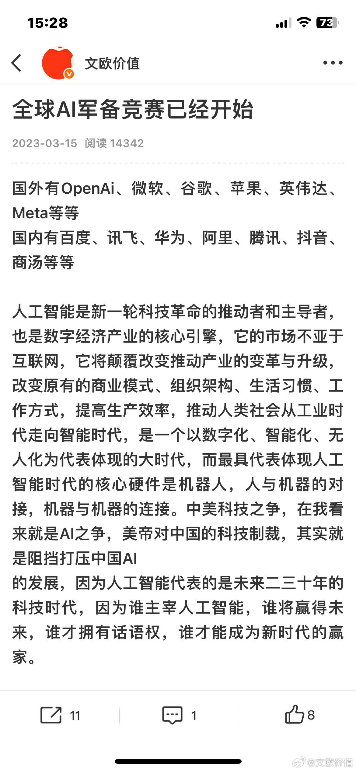 2023-3-15所说:全球AI军备竞赛已经开始,中美科技之争,在我看来就是AI之争,美帝对中国的科技制裁,其实就是阻挡打压中国AI的发展,因为人工智能代表的是未来二三十年的科技时代,因为谁主宰人工智能,谁将赢得未来,谁才拥有话语权,谁才能成为新时代的赢家…🌹