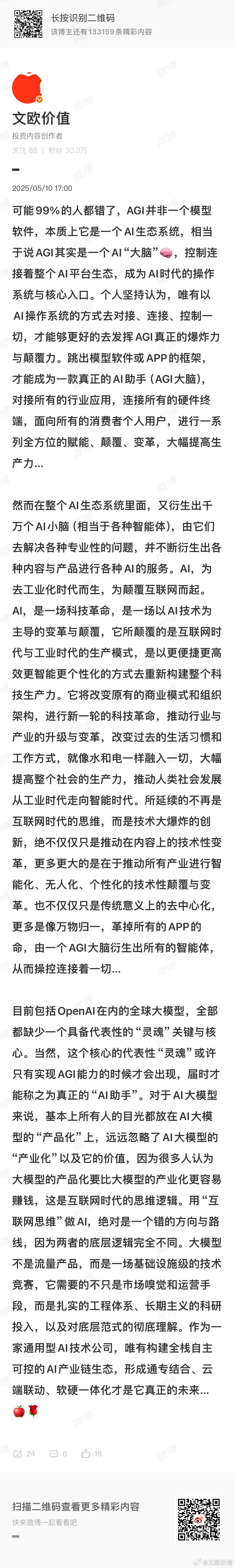 2025-5-10所说:AI,为去工业化时代而生,为颠覆互联网而起。AI,是一场科技革命,是一场以AI技术为主导的变革与颠覆,它所颠覆的是互联网时代与工业时代的生产模式,是以更便捷更高效更智能更个性化的方式去重新构建整个科技生产力。它将改变原有的商业模式和组织架构,进行新一轮的科技革命,推动行业与产业的升级与变革,改变过去的生活习惯和工作方式,就像水和电一样融入一切,大幅提高整个社会的生产力,推动人类社会发展从工业时代走向智能时代。所延续的不再是互联网时代的思维,而是技术大爆炸的创新,绝不仅仅只是推动在内容上的技术性变革,更多更大的是在于推动所有产业进行智能化、无人化、个性化的技术性颠覆与变革。也不仅仅只是传统意义上的去中心化,更多是像万物归一,革掉所有的APP的命,由一个AGI大脑衍生出所有的智能体,从而操控连接着一切…🌹