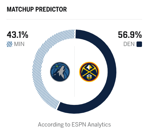 ESPN预测明日比赛:掘金胜率56.9%,森林狼胜率43.1%