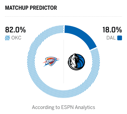 ESPN预测明日比赛:雷霆胜率82.0%,独行侠胜率18.0%