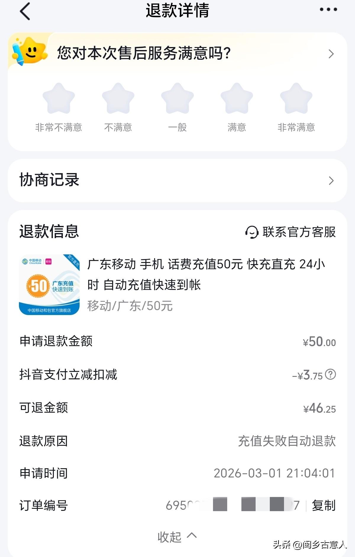 没想到抖音话费充值优惠减免,是逗你玩的,下单了直接充值失败,给你退款,玩不起就别搞虚的! 看到抖音充值话费用银行有减免,就下单充值了(早上9点左右下单),等了半天也没见有充值短信。 结果到了晚上9点多,收到退款的短信,上抖音一看原来是充值失败了。 好家伙!在选择充值付款时,用其他的付款方式,是没有优惠的,只有绑定银行卡付款才有随机立减的活动。 我就是为了这几块钱才绑定的,也刷脸验了,结果银行卡绑定了,却不给我减免,直接退单了,想再下单充值50元,却变成了在维护,不让你充了! 整的我很是无语啊[抠鼻]