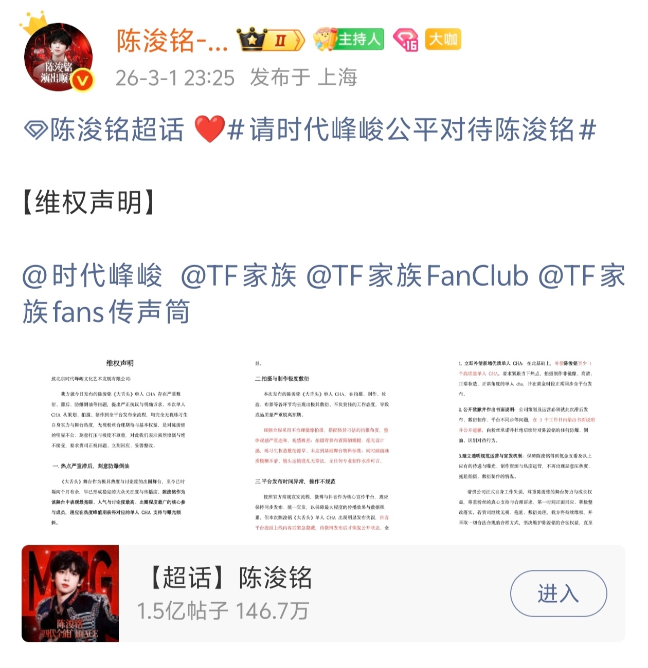 陈浚铭数据组维权,禁止打压,尊重陈浚铭和粉丝的努力付出。