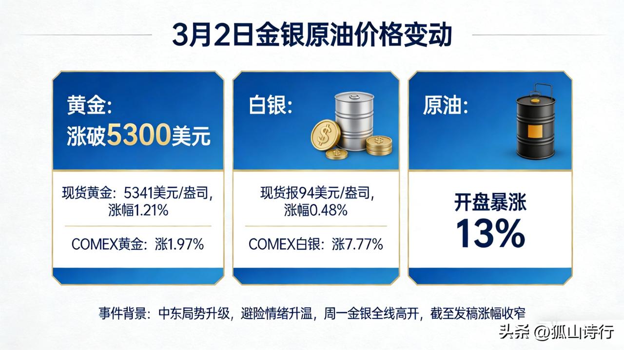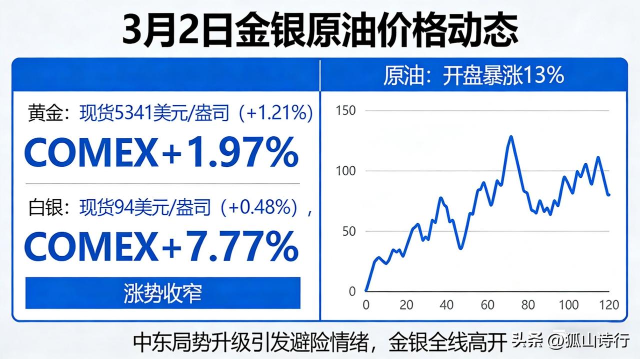 中东局势升级!国际金价、油价全线暴涨 受中东局势骤然升级影响,全球避险情绪急剧升温,3月2日贵金属与原油市场迎来大幅高开,具体数据如下: 贵金属市场: ☆现货黄金:5341美元/盎司,+1.21%(突破5300美元关口) ☆现货白银:94美元/盎司,+0.48% ☆ COMEX黄金:+1.97% ☆ COMEX白银:+7.77% 原油市场: ★布伦特原油:79.62美元/桶,+9.27%(开盘暴涨13%) ★ WTI原油:75.33美元/桶,+9.0% 中东局势引发黄金原油暴涨: 地缘冲突加剧了全球能源供应的脆弱性,资金大量涌入避险资产,推动黄金、原油价格同步飙升,后续走势将高度取决于中东冲突的持续时间与升级程度。 贵金属国际行情 【图片及参考信息来源】 央视新闻