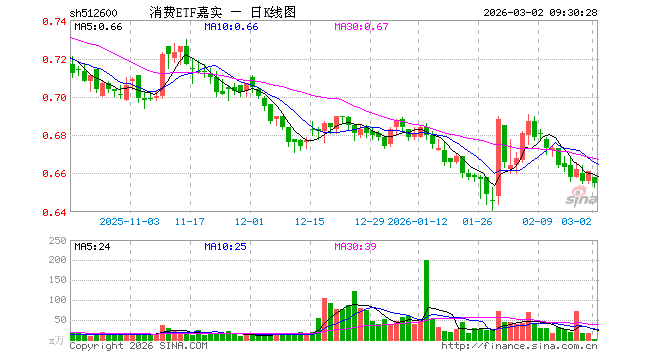 3月2日,消费ETF嘉实(512600)开盘跌0.45%,报0.658元。消费ETF嘉实(512600)重仓股方面,伊利股份开盘跌0.50%,贵州茅台跌0.35%,牧原股份跌0.85%,五粮液跌1.01%,温氏股份跌0.88%,泸州老窖跌1.38%,山西汾酒跌0.70%,海天味业跌0.89%,东鹏饮料跌1.06%,海大集团跌1.35%。
