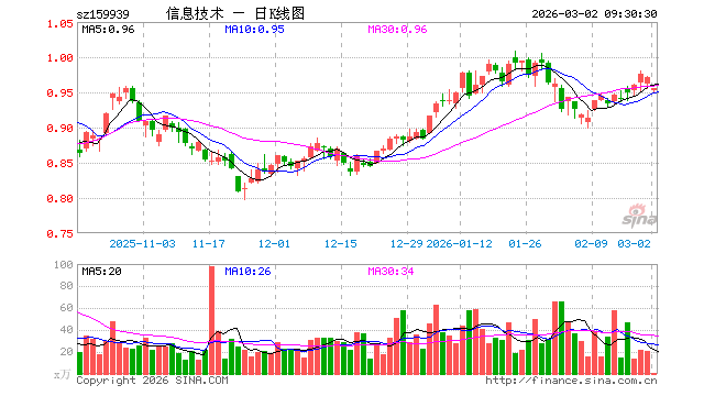 3月2日,信息技术ETF(159939)开盘跌1.96%,报0.952元。信息技术ETF(159939)重仓股方面,立讯精密开盘跌1.81%,寒武纪跌2.38%,工业富联跌3.05%,中芯国际跌1.84%,海光信息跌2.31%,北方华创跌1.55%,胜宏科技跌1.34%,京东方A跌0.89%,兆易创新跌3.04%,澜起科技跌2.76%。