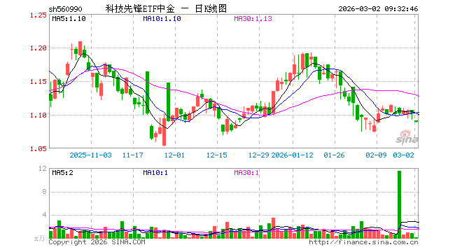 3月2日,科技先锋ETF中金(560990)开盘跌1.00%,报1.091元。科技先锋ETF中金(560990)重仓股方面,宁德时代开盘跌0.30%,寒武纪跌2.38%,恒瑞医药跌1.73%,药明康德跌1.95%,工业富联跌3.05%,阳光电源跌1.67%,海光信息跌2.31%,立讯精密跌1.81%,中芯国际跌1.84%,北方华创跌1.55%。
