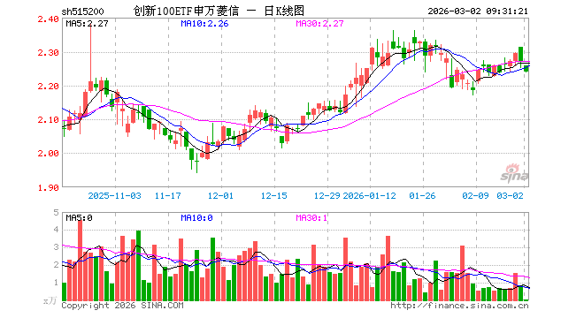 3月2日,创新100ETF申万菱信(515200)开盘跌0.44%,报2.258元。创新100ETF申万菱信(515200)重仓股方面,中际旭创开盘跌2.62%,寒武纪跌2.38%,恒瑞医药跌1.73%,比亚迪跌1.48%,海光信息跌2.31%,北方华创跌1.55%,兆易创新跌3.04%,汇川技术跌1.60%,澜起科技跌2.76%,三一重工跌0.65%。