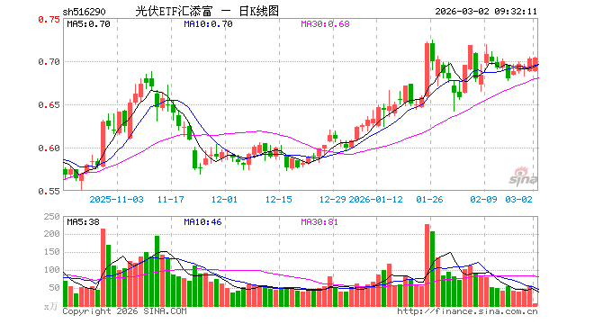 3月2日,光伏ETF汇添富(516290)开盘跌2.13%,报0.688元。光伏ETF汇添富(516290)重仓股方面,特变电工开盘跌1.25%,隆基绿能跌1.91%,阳光电源跌1.67%,TCL科技跌1.61%,迈为股份跌3.77%,德业股份跌1.74%,正泰电器跌0.73%,TCL中环跌2.71%,捷佳伟创跌2.61%。