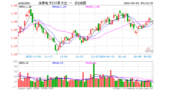 3月2日,消费电子ETF易方达(562950)开盘跌0.99%,报1.298元。消费电子ETF易方达(562950)重仓股方面,立讯精密开盘跌1.81%,寒武纪跌2.38%,工业富联跌3.05%,中芯国际跌1.84%,京东方A跌0.89%,兆易创新跌3.04%,澜起科技跌2.76%,东山精密跌1.81%,豪威集团跌2.13%,生益科技跌3.02%。