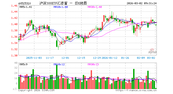 3月2日,沪深300ETF汇添富(515310)开盘跌0.57%,报1.398元。沪深300ETF汇添富(515310)重仓股方面,宁德时代开盘跌0.30%,贵州茅台跌0.35%,中国平安跌1.08%,中际旭创跌2.62%,紫金矿业涨2.15%,招商银行跌0.39%,新易盛跌3.37%,美的集团跌0.81%,兴业银行跌0.27%,长江电力涨0.31%。