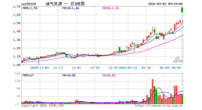 3月2日,油气ETF汇添富(159309)开盘涨9.80%,报1.680元。油气ETF汇添富(159309)重仓股方面,中国石油开盘涨8.66%,中国海油涨10.01%,中国石化涨5.26%,杰瑞股份跌0.01%,招商轮船涨7.76%,广汇能源涨8.33%,中远海能涨10.01%,洲际油气涨9.98%,海油工程涨7.63%,招商南油涨9.98%。